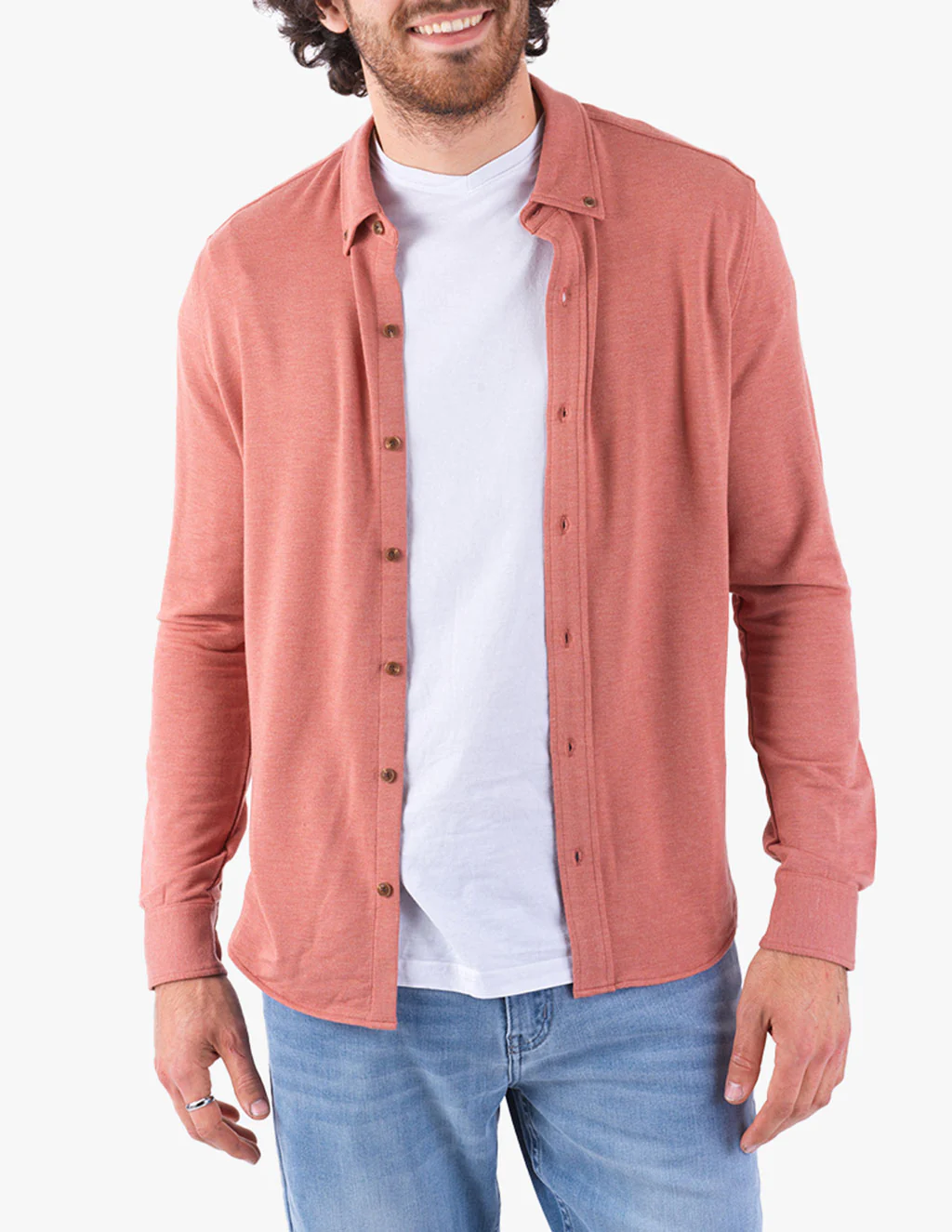 A true all-around performer. This red cashmere button down is stitched with fabrics that are so buttery soft it wouldn’t surprise us if you wore it for 48 straight hours. It comes in a smooth color and is thin enough to layer if that’s your kind of thing. It's built with work, play, and lounge in mind and brimming with stretch. Look good in any occasion.Â